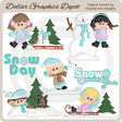 This collection includes adorable winter boys and girls, wearing winter clothing, hats, and ear muffs, lots of snow, pine trees, sleds, snowmen, snowballs, a puppy dog, and two winter word art graphics - "Snow Day" and "Snow Much Fun." This set contains 7 graphics.