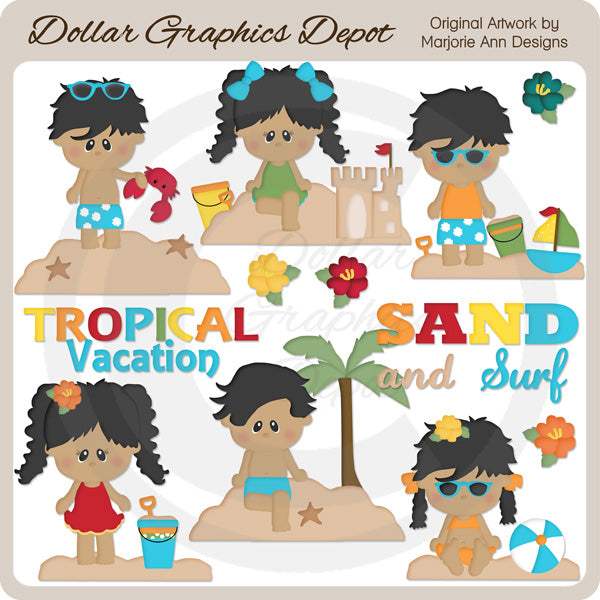 This large collection includes adorable little boys and girls, lots of sand, starfish, a crab, sunglasses, sand buckets and shovels, a sand castle, a sailboat, a palm tree, a beach ball, tropical flowers, and two word art graphics - "Tropical Vacation" and "Sand and Surf." This set contains 12 graphics.