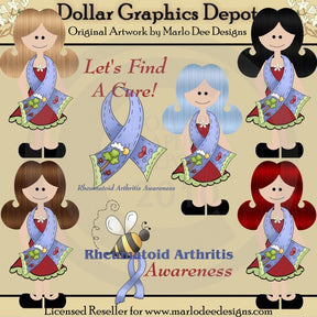 This collection includes five beautiful ladies, wearing pretty red dresses, with green trim and white flowers, pretty blue rheumatoid arthritis awareness ribbons, with a tree, flowers, grass, sun, clouds, and a red heart, and two word art graphics - an awareness ribbon that reads "Let's Find A Cure" and "Rheumatoid Arthritis Awareness," and a bumble bee with blue ribbon that reads "Rheumatoid Arthritis Awareness." This set contains 7 graphics.