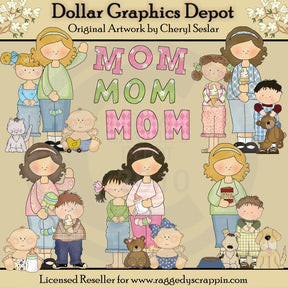 This one-of-a-kind collection is only available at Digital Craft Supplies. This set includes five moms, three little girls, three little boys, three babies, one kitten, two puppy dogs, dog bowl, dog food, baby duck toy, baby rattles, baby bottles, ice cream cones, and three "Mom" word art graphics. This exclusive set contains 8 graphics.