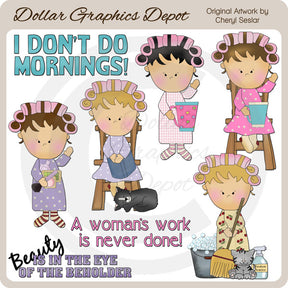 This collection includes mommies with nightgowns, socks, hair rollers, wooden chairs, cups of coffee, makeup, kitty cats, a reading book, a broom, a bucket of suds, a window cleaner, and three word art graphics - "I Don't Do Mornings," "A Woman's Work Is Never Done," and "Beauty Is In The Eye Of The Beholder." This set contains 8 graphics.