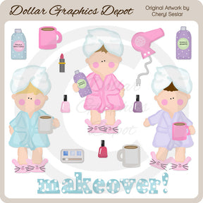 This large collection includes three pretty mommies with bathrobes, hair wraps, and cute little bunny slippers, cups of coffee, a hair dryer, shampoo, conditioner, three bottles of nail polish, lipstick,, eye shadow, and one "Makeover" word art graphic. This set contains 14 graphics.