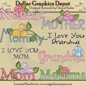 This collection includes eight Mother's Day word art graphics, with colorful roses and a little blue bird, in pink, purple, blue, yellow, and green: "Nonnie," "Mother," "Mommy," "I Love You Grandma," "I Love You Mom," "Grandma," "Mom," and "Momma." This set contains 8 word art graphics.