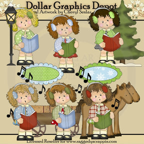 This collection includes six little girls, singing Christmas carols, with pretty patterned dresses, winter sweaters, ear muffs, caroling song books, a snowy lamp post, a pine tree, a horse drawn carriage, music notes. and two scalloped caroling signs, for you to customize. This set contains 6 graphics.
