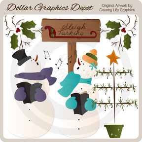 This collection includes two caroling snowmen with winter hats, scarves, mittens, caroling song books, and music notes, a wooden sign with a red sleigh and "Sleigh Parking" word art, a potted Christmas tree with a gold star on top, and a holly berry branch (duplicated and reversed in preview). This set contains 5 graphics.