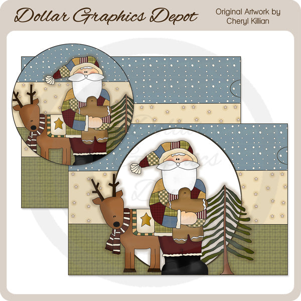 This collection includes a gallon paint can set - front wrapper, back wrapper, and lid cover, a tri-colored background: blue with white snow, tan with glowing stars, a green quilted pattern, a white oval silhouette, a patchwork Santa, a reindeer, a pine tree, and a cute little gingerbread man. This set contains 3 wrappers.