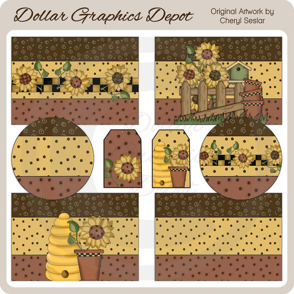 This collection includes four gallon paint can covers (three front covers and one back cover), two coordinating lids, and two matching gift tags. Designs include: dark brown, gold, and medium brown backgrounds with polka dot, swirl, and checkered designs, pretty sunflowers, clay pots, a patch of grass, a picket fence, a birdhouse, and beehives. PLEASE NOTE: This collection coordinates with the "Sunflower Wishes - Clip Art," "Sunflower - Blocks," "Sunflower - Bookmark Sheet," "Sunflower - Cup Covers," and "Sunflower - Sheet Tags" collections. The This set contains 8 printables.