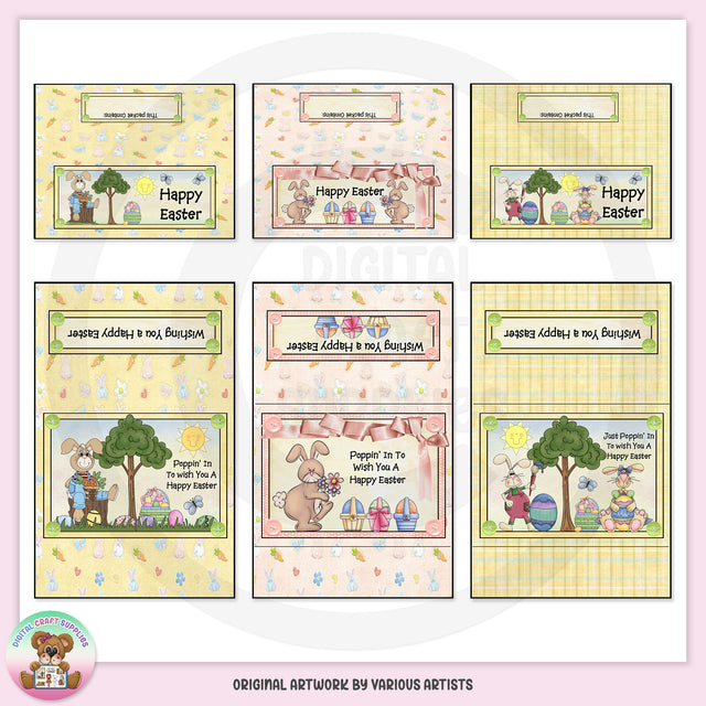 This one-of-a-kind collection is only available at Digital Craft Supplies. This collection includes three 5.7" x 8.9" standard size microwave popcorn wrappers and three 6.5" x 2.5" popcorn toppers. Designs include: cute little Easter bunnies, painted Easter eggs, baskets of Easter eggs, a basket of fresh carrots, grass, trees, a tree stump, butterflies, the sun, pink ribbon, pink and green buttons, and pretty plaid and Easter motif backgrounds. Word art includes: "Happy Easter," "Wishing You A Happy Easter," and "Just Poppin' In To Wish You A Happy Easter." This exclusive set contains 6 individual printables and 6 "Ready To Print" pages (not shown in preview).