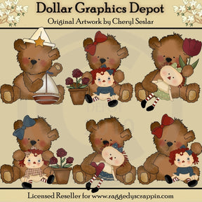 This collection includes six tattered teddies, pretty hair bows, prim raggedy Annie dolls, clay flower pots with red roses, a red tulip, a sailor hat, and a prim sail boat. This set contains 6 graphics.