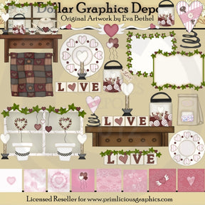 This large collection includes a wooden shelf with a pretty window, heart and ivy garland, prim quilt, heart shaped candle lamp, a candle jar filled with a heart shaped candle lamp, cinnamon bun candle tarts, and Valentine blocks, painted teacups, and a teapot, a pretty heart border, a prim candle lamp with pretty heart plate, a candle jar filled with a heart shaped candle lamp, cinnamon bun candle tarts, Valentine blocks, heart shaped balloons, and a gift tag that reads "Love," two pretty signs with heart and ivy garland, a pretty quilted heart on a spring with a little silver key, a candle jar filled with a heart shaped candle lamp, cinnamon bun candle tarts, and Valentine blocks, prim Valentine blocks that spell "Love," a wooden shelf with a pretty quilted heart on a spring, a heart shaped candle lamp, prim Valentine blocks that spell "Love," and a candle jar filled with a heart shaped candle lamp, cinnamon bun candle tarts, and Valentine blocks, a brown bag filled with Valentine heart candies, a Valentine plate with pretty pink and white hearts, Valentine blocks that spell "Love" with heart and ivy garland, a white crackled window with heart and ivy garland, heart shaped candle lamps, painted flower pots with heart shaped topiaries, and pretty hearts on strings, and eight coordinating Valentine background tiles. This set contains 22 graphics.