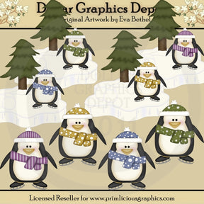 This collection includes eight adorable little penguins, with colorful winter hats, scarves, and ice skates, frozen ponds, snow, snowballs, and pine trees. This set contains 8 graphics.
