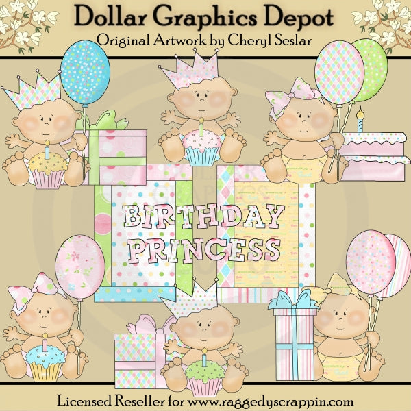 This collection includes six birthday princess babies, wearing pretty bows, princess crowns, and diaper covers in pink, yellow, blue, green, and white, birthday balloons, a pretty pink birthday cake, cupcakes with candles, birthday gifts with pretty bows, two matching, full size card frames, and one "Birthday Princess" word art graphic. This set contains 9 graphics.