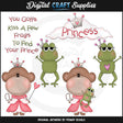 This collection includes two pretty princess monkeys, wearing pink princess dresses and crowns, with little hearts, a heart shaped princess wand, and a cute little frog with a pink heart, a fluffy cloud with a princess crown and the word "Princess," a frog with a prince crown and little pink heart, and a frog with a prince crown and "You Gotta Kiss A Few Frogs To Find Your Prince" word art. This set contains 5 graphics.