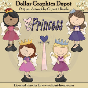 This one-of-a-kind collection is only available at Digital Craft Supplies. This set includes four princess angels wearing pretty dresses in red, pink, and purple, gold and silver princess crowns, a heart shaped princess wand, and one "Princess" word art graphic. This exclusive set contains 6 graphics.