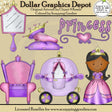 This collection includes a pretty princess, wearing a pink and purple princess dress and pretty tiara, a royal princess throne, a beautiful princess carriage, a pretty princess mirror, a satin pillow with little hearts, a princess slipper, and gold princess crown, and one "Princess" word art graphic. This set contains 6 graphics.