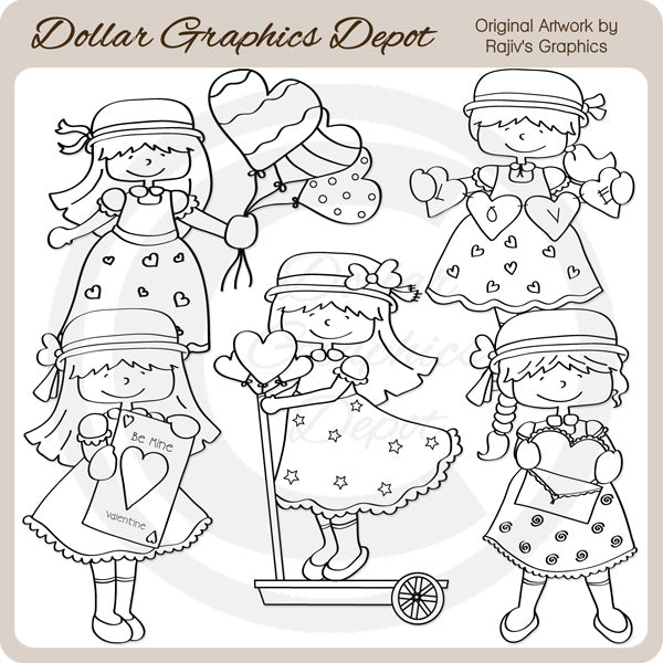 This collection includes adorable little Valentine girls with pretty dresses, hats, heart shaped balloons, a heart cut-out that spells "LOVE," a Valentine card with "Be Mine Valentine" word art, a scooter, and a heart shaped Valentine card in an envelope. PLEASE NOTE: This set coordinates with the "Valentine Girls 1 - Clip Art" collection. This set contains 5 digital stamps.