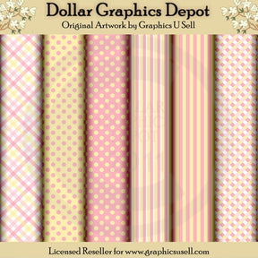This collection includes six 12" x 12" pastel colored papers. Patterns include: plaid, polka dot, stripe, and gingham. Colors include: pink, yellow, and white. This set contains 6 scrap papers.