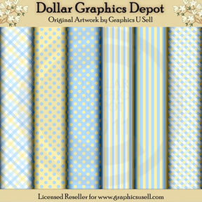 This collection includes six 12" x 12" pastel colored papers. Patterns include: plaid, polka dot, stripe, and gingham. Colors include: blue, yellow, and white. This set contains 6 scrap papers.
