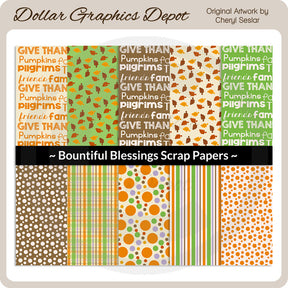 This collection includes ten beautiful, 12" x 12" Thanksgiving scrap papers, with colorful autumn leaves, Thanksgiving word art, polka dots, stripes, and plaid patterns. PLEASE NOTE: This set coordinates with the "Bountiful Blessings - Clip Art," "Bountiful Blessings Bag Toppers," "Thankful Bag Toppers," and "Thankful Mini Candy Pouches" collections. This set contains 10 scrap papers.