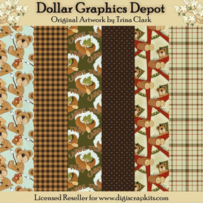 This collection includes six 12" x 12" canoe trip scrap papers. Patterns include: bears with marshmallows on sticks and campfires, orange and brown gingham, canoes, paddles, clouds, pine trees, and "Canoe Trip" word art, brown and orange polka dots, bears with teepees and fire wood, and green, red, and cream plaid patterns. PLEASE NOTE: This set coordinates with the "Canoe Trip" graphic collection. This set contains 6 scrapbook papers.