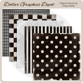This collection includes five beautiful, 12" x 12" ebony and ivory scrap papers, with argyle, checker, scroll, stripe, and polka dot patterns. This set contains 5 scrap papers.