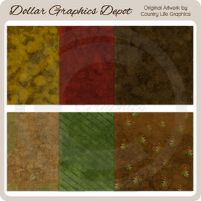 This collection includes six 8" x 8" fall scrap papers, each with watercolor effects in brown, gold, green, red, and burnt orange, one with stripes and one with autumn leaves. This set contains 6 scrap papers.