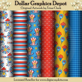 This collection includes six 12" x 12" Fourth of July scrap papers. Patterns include: fireworks, pinwheels, and "Happy 4th" word art, red white, and blue stripes, patriotic hats and stars, red and white polka dots, ice cream cones and balloons, and a blue plaid pattern. PLEASE NOTE: This set coordinates with the "Happy 4th" graphic collection. This set contains 6 scrapbook papers.