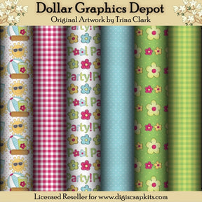 This collection includes six, 12" x 12" pool party, scrap papers. Patterns include: polka dots with a smiley sun and sunglasses, a beach ball, cool drink, and a hot dog, gingham patterns (2), flowers with "Pool Party" word art, polka dots, and polka dots with flowers. PLEASE NOTE: This set coordinates with the "Pool Party 1" graphic collection. This set contains 6 scrapbook papers.