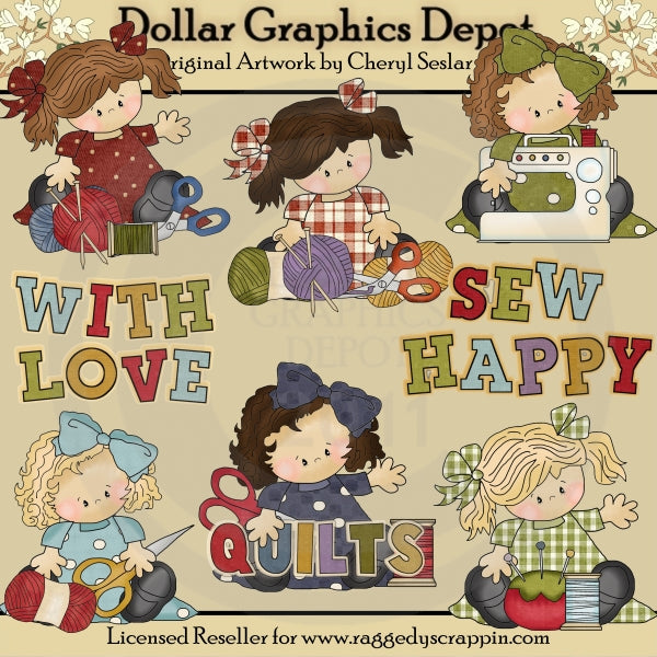 This collection includes six adorable little girls, wearing pretty polka dot, plaid, and gingham dresses, and matching hair bows, "Quilts" word art, colorful yarn, knitting needles, spools of thread, scissors, a tomato shaped pin cushion, sewing pins, a sewing machine, and two word art graphics: "With Love," and "Sew Happy." This set contains 8 graphics.