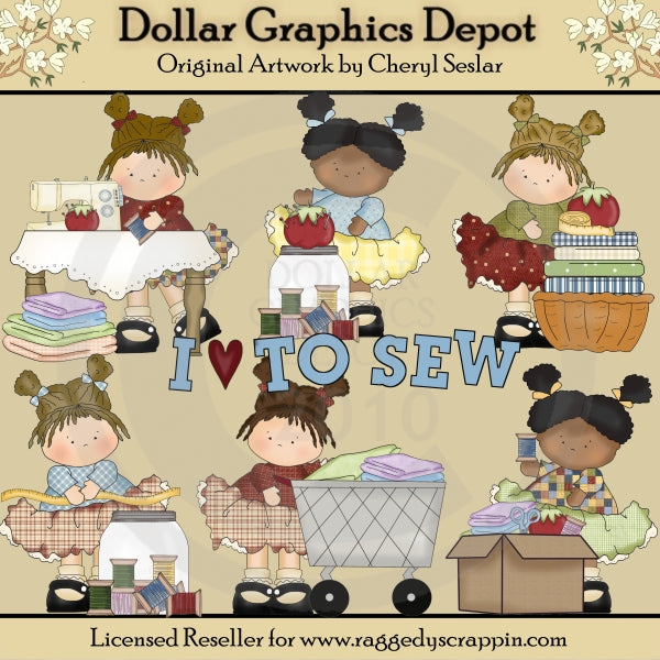 This one-of-a-kind collection is only available at Digital Craft Supplies. This set includes six little sewing girls, a sewing machine, spools of thread in a jar, multi colored fabric, tape measures, pin cushions, and one "I Love To Sew" word art graphic. This exclusive set contains 7 graphics.
