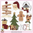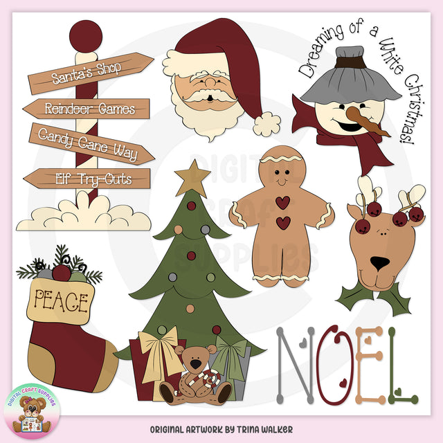 This collection includes the North Pole with fluffy snow and wooden signs that read: "Santa's Shop," "Reindeer Games," "Candy Cane Way," and "Elf Try-Outs," Santa Claus, a snowman with "Dreaming Of A White Christmas" word art, a stitched "Peace" stocking filled with greenery, a decorated Christmas tree with wrapped presents, a stuffed teddy bear, and candy canes, a gingerbread man, a reindeer with ornaments, and one "Noel" word art graphic. This set contains 8 graphics.
