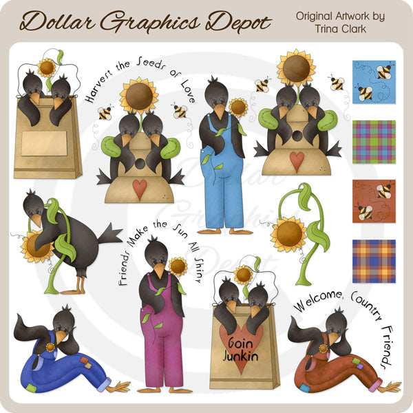 This large collection includes two crows peeking out of a brown sack with a sunflower and a blank tag for you to customize, two crows with a beehive, bees, a sunflower, and "Harvest The Seeds Of Love" word art, a standing crow wearing overalls holding a sunflower, two crows with a beehive, bees, and a sunflower, a crow and a sunflower, a sitting crow wearing overalls and waving hello, a standing crow wearing overalls holding a sunflower with "Friends Make The Sun All Shiny" word art, two crows peeking out of a brown sack with a sunflower, a heart, and "Goin Junkin" word art, a sitting crow wearing overalls and waving hello with "Welcome Country Friends" word art, and four coordinating background tiles. This set contains 14 graphics.