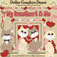 This collection includes a boy kitty cat with a bow tie and a red polka dot heart, a girl kitty cat with a red polka dot scarf and a pink heart, two kitty cat sweethearts - the girl with a pink striped scarf, the boy with a red polka dot bow tie, and a pink heart, a pretty heart frame with a red polka dot center, a red ribbon with little pink hearts, a collection of red and pink hearts, a heart border, and one "My Sweetheart and Me" word art graphic. PLEASE NOTE: This set coordinates with "My Sweetheart 1 - Scrap Papers," "My Sweetheart 1 - Scrap Elements," "My Sweetheart 1- Cutting Files / Paper Piecing Patterns," and "My Sweetheart 2 - Cutting Files / Paper Piecing Patterns" collections. This set contains 8 graphics.