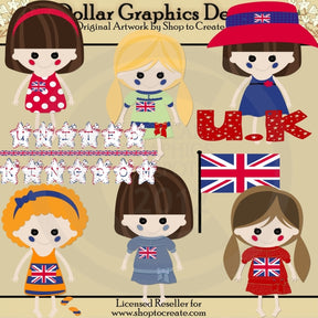 This collection includes six adorable British dolls, each with cute little button eyes, colored cheeks, stitched mouths, and British flags - one has a red and white polka dot dress and a matching headband, one has a pretty green and blue dress, one has a pretty blue dress and red and blue hat, one has an orange and blue striped dress, matching headband, and flip flops, one has a pretty blue dress, and one has a pretty red polka dot dress. This collection also includes two word art graphics - "United Kingdom" and "UK," and one British flag. This set contains 9 graphics.