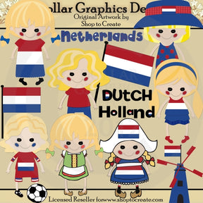 This collection includes seven adorable Dutch dolls, each with cute little button eyes, colored cheeks, stitched mouths, and Dutch flags - one has a pretty red, white, and blue striped dress and blue hair bows, one has a pretty blue and red polka dot dress and a matching hat, one has blue pants, a red T-shirt, and a Dutch flag, one has a red, white, and blue dress and a blue headband, one has a red, white, and blue outfit and a soccer ball, one has a green, yellow, orange, and white dress, green hair bows, and Dutch shoes, and one has a red, white, and blue dress, a Dutch hat, Dutch shoes, and red hair bows. This collection also includes three word art graphics - "Netherlands," "Dutch," and "Holland," a Dutch windmill, and a Dutch flag. This set contains 12 graphics.