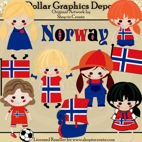 This collection includes six adorable Norwegian dolls, each with cute little button eyes, colored cheeks, stitched mouths, and Norwegian flags - one has a blue dress with pretty red flower, one has a blue skirt and a Norwegian flag T-shirt, one has a Norwegian flag dress, one has blue jean overalls, a red T-shirt, a red baseball cap, and a Norwegian flag, one has a red, white, and blue soccer outfit and a soccer ball, and one has a Norwegian bunad outfit. This collection also includes a Norwegian flag, a Viking ship, and one "Norway" word art graphic. This set contains 9 graphics.