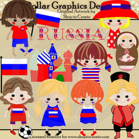 This collection includes seven adorable Russian dolls, each with cute little button eyes, colored cheeks, stitched mouths, and Russian flags - one has a red and blue outfit, flip flops, and a Russian flag, one has a pretty red and white polka dot dress and a red, white, and blue hat, one has a red, white, and blue striped dress and blue hair bows, one has a red, white, and blue outfit and a soccer ball, two have pretty red, white, and blue dresses, and one has a black and red Russian Crossack outfit and hat. This collection also includes one "Russia" word art graphic, Saint Basil's Cathedral, a pretty pink and brown Matryoshka doll, and a Russian flag. This set contains 11 graphics.