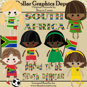 This collection includes six adorable South African dolls, each with cute little button eyes, colored cheeks, stitched mouths, and South African flags - two have pretty green dresses with little red bows, one has a red, green, and blue outfit and a soccer ball, one has a yellow, red, and white outfit, one has a pretty green and yellow dress, a matching headband, and a South African flag, and one has a yellow and green patterned outfit, a matching headband, and flip flops. This collection also includes two word art graphics - "South Africa" and "Proud To Be South African," and one South African flag. This set contains 9 graphics.
