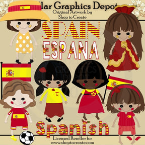 This collection includes six adorable Spanish dolls, each with cute little button eyes, colored cheeks, stitched mouths, and Spanish flags - one has a pretty yellow and white polka dot dress and a yellow and red hat, one has a pretty yellow and red floral gown and a matching crown, one has a red, yellow, and white outfit and a soccer ball, one has a red skirt, long sleeve yellow shirt, and a rose hair clip, one has a pretty red and yellow dress and a Spanish flag, and one has a pretty red patterned outfit, a matching headband, and flip flops. This collection also includes three word art graphics - "Spain," "Espana," and "Spanish," and one Spanish flag. This set contains 10 graphics.