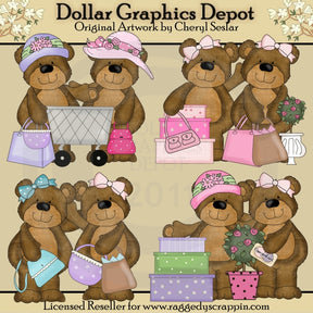This collection includes eight adorable little bears, with pretty floral hats and hair bows, boutique boxes, boutique shopping bags, cute little designer purses, a shopping cart, a credit card, and pretty topiary plants. This set contains 4 graphics.
