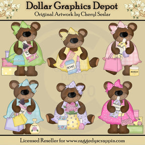 This one-of-a-kind collection is only available at Digital Craft Supplies. This set includes six foo foo bears dressed up in pretty dresses and bows, stylish little purses, gift boxes, gift bags, body wash, shampoo, soap, perfume, lipstick, comb, bronzer, nail polish, lotion, and pretty flowers. This exclusive set contains 6 graphics.