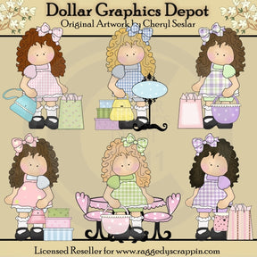 This collection includes six little girls, wearing pretty gingham, plaid, and polka dot outfits, and matching hair bows, cute little designer purses, boutique shopping bags, pretty boutique boxes, a pretty boutique table and chair set, and a boutique sign, ready for you to customize. This set contains 6 graphics.