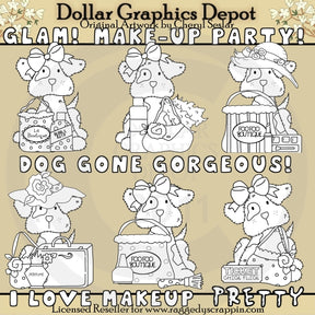 This one-of-a-kind collection is only available at Digital Craft Supplies. This set includes six adorable little spotted puppies, pretty hair bows, floral hats, a fluffy boa, boutique shopping bags, pretty purses, a bottle of bubble bath, a bottle of lotion, lipstick, eye shadow kit, pretty perfume bottle, a make up case, a bottle of nail polish, a powder brush, a "Chick Flick" movie ticket, and five word art graphics - "Glam," "Make-Up Party," "Dog Gone Gorgeous," "I love Make Up," and "Pretty." This exclusive set contains 11 digital stamps.