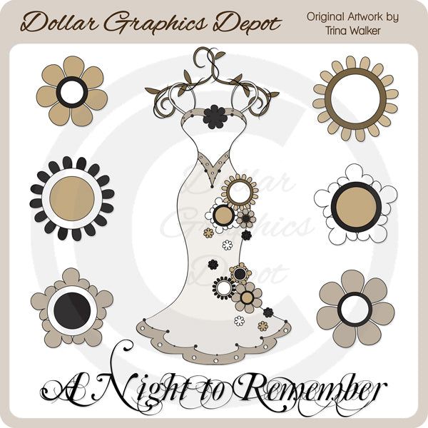 This collection includes a beautiful floral and sequence gown hanging on a pretty leafy branch hanger, six coordinating flowers, and one "A Night To Remember" word art graphic. This set contains 8 graphics.