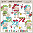 This large collection includes adorable little Christmas babies, with striped t-shirts, diapers, and Santa hats, Christmas stockings with candy canes, cute little gingerbread men, strands of Christmas lights, wrapped Christmas presents with pretty bows, and one "My First Christmas" word art graphic. This set contains 12 graphics.
