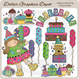 This collection includes a little girl with a with a colorful dress, party hat, and balloons, decorated cookies, an ice cream sundae, frosted cupcakes with cherries on top, party confetti, a layered cake with candle, party balloons, party hats, a wrapped present with pretty bow, an ice cream cone, a puppy with a party hat, sitting inside a gift box, and one "Celebrate" word art graphic. This set contains 14 graphics.