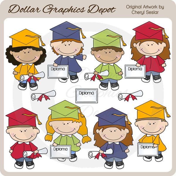 This collection includes cute litte graduate boys and girls with caps, gowns, and diplomas. This set contains 10 graphics.