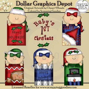 This collection includes five little babies, wearing Christmas hats, some with pretty bows and holly berry leaves, five Christmas gift bags - one red gift bag, with holly berry leaves, that reads "Happy Holidays," one blue gift bag, with Santa Claus, that reads "Santa Claus," one red gift bag, with a gingerbread man, that reads "Joy," one blue gift bag, with white scalloped trim, that reads "Happy Holidays," and one green gift bag, with a snowman, that reads "Tis The Season," and one "Baby's 1st Christmas" word art graphic. This set contains 6 graphics.