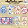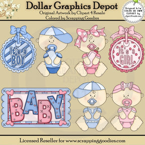 This collection includes a cute little baby boy, dressed in a blue T-shirt, diaper cover, and a hat, with a baby bottle and a pacifier, a cute little baby girl, dressed in a pink T-shirt, diaper cover, and a pretty bow, with a baby bottle and a pacifier, a blue striped medallion, with ruffles and a pretty bow, that reads "It's A Boy," a pink polka dot medallion, with ruffles and a pretty bow, that reads "It's A Girl," a little baby boy and baby girl sitting together, and one "Baby" word art graphic. This set contains 6 graphics.