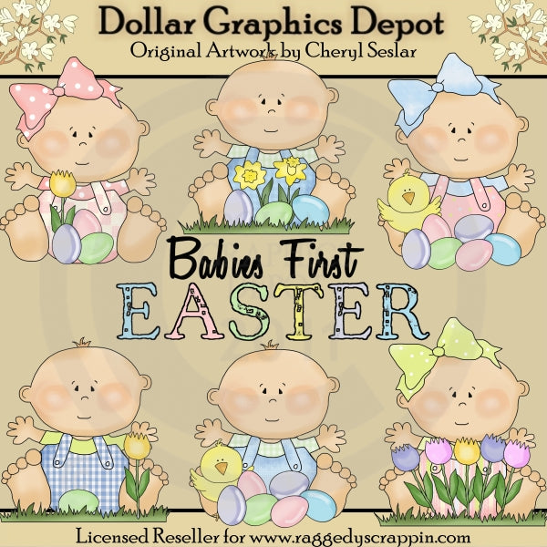 This collection includes six adorable little Easter babies, wearing overalls, T-shirts, and pretty hair bows, colored Easter eggs, tulip and daffodil flowers, patches of grass, cute little baby chicks, and one "Babies First Easter" word art graphic. Colors include: pink, blue, green, yellow, purple, white, tan, and black. This set contains 7 graphics.